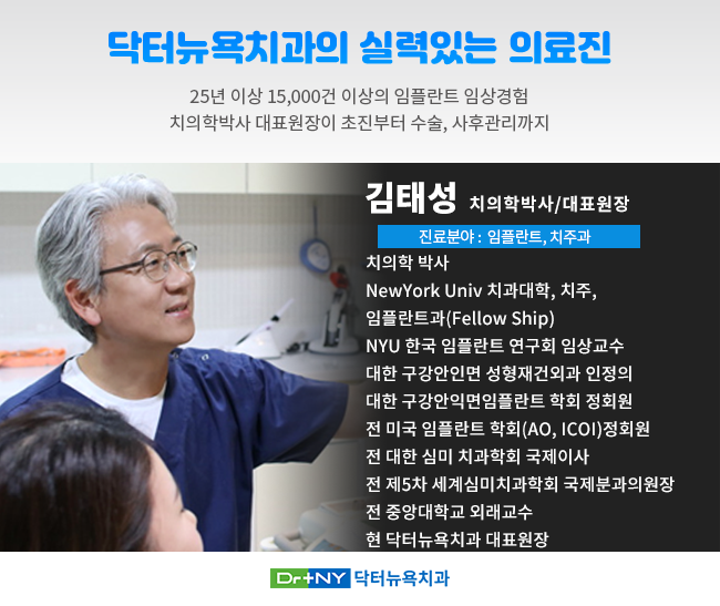 김태성 대표원장은 NewYork Univ 치과대학, 치주, 임플란트과(Fellow Ship), 미국 치과의사