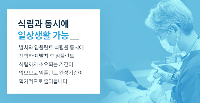이름처럼 발치 당일 임플란트를 식립하게 되어 수술횟수와 임플란트치료기간을 현저하게